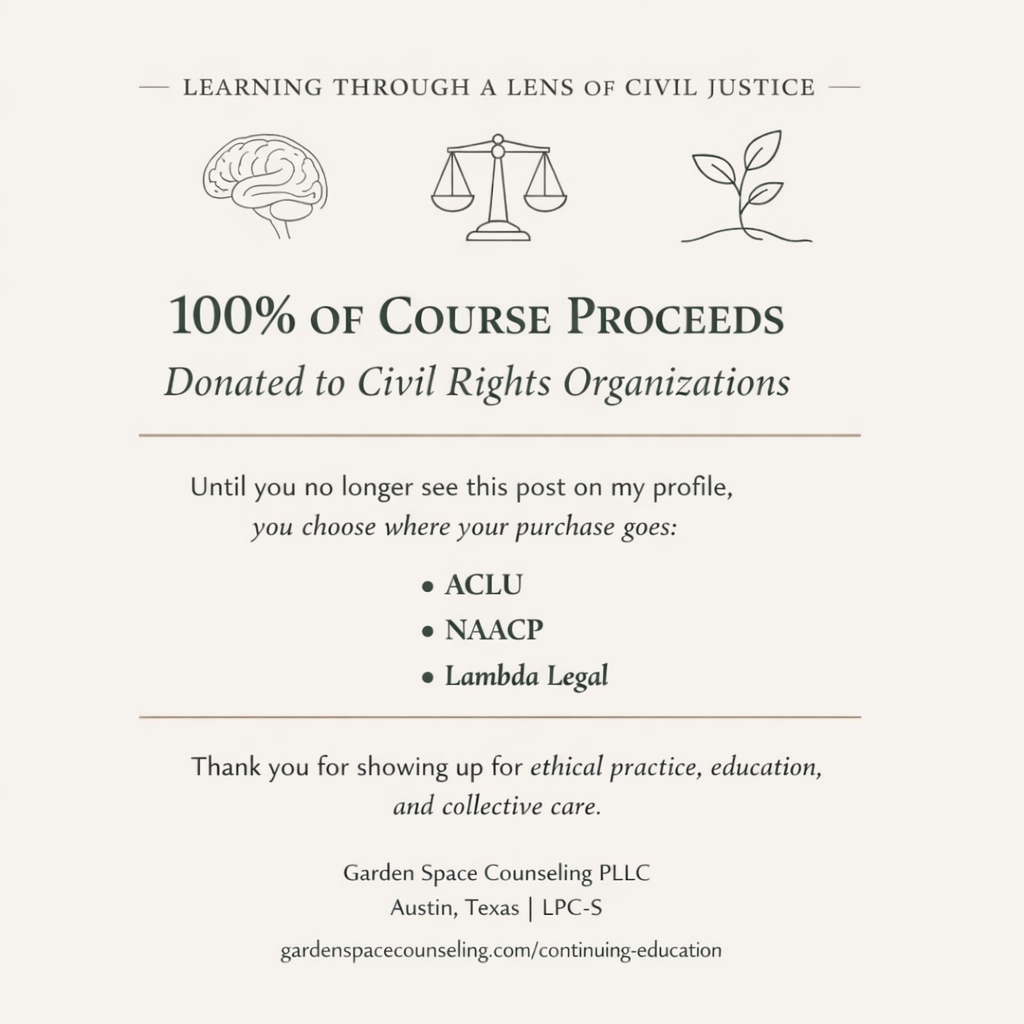 Garden Space Counseling PLLC is committed to high-quality continuing education. Participants who have concerns, complaints, or grievances related to course content, instructor conduct, facility/technology issues, or administrative processes may submit a formal grievance.
